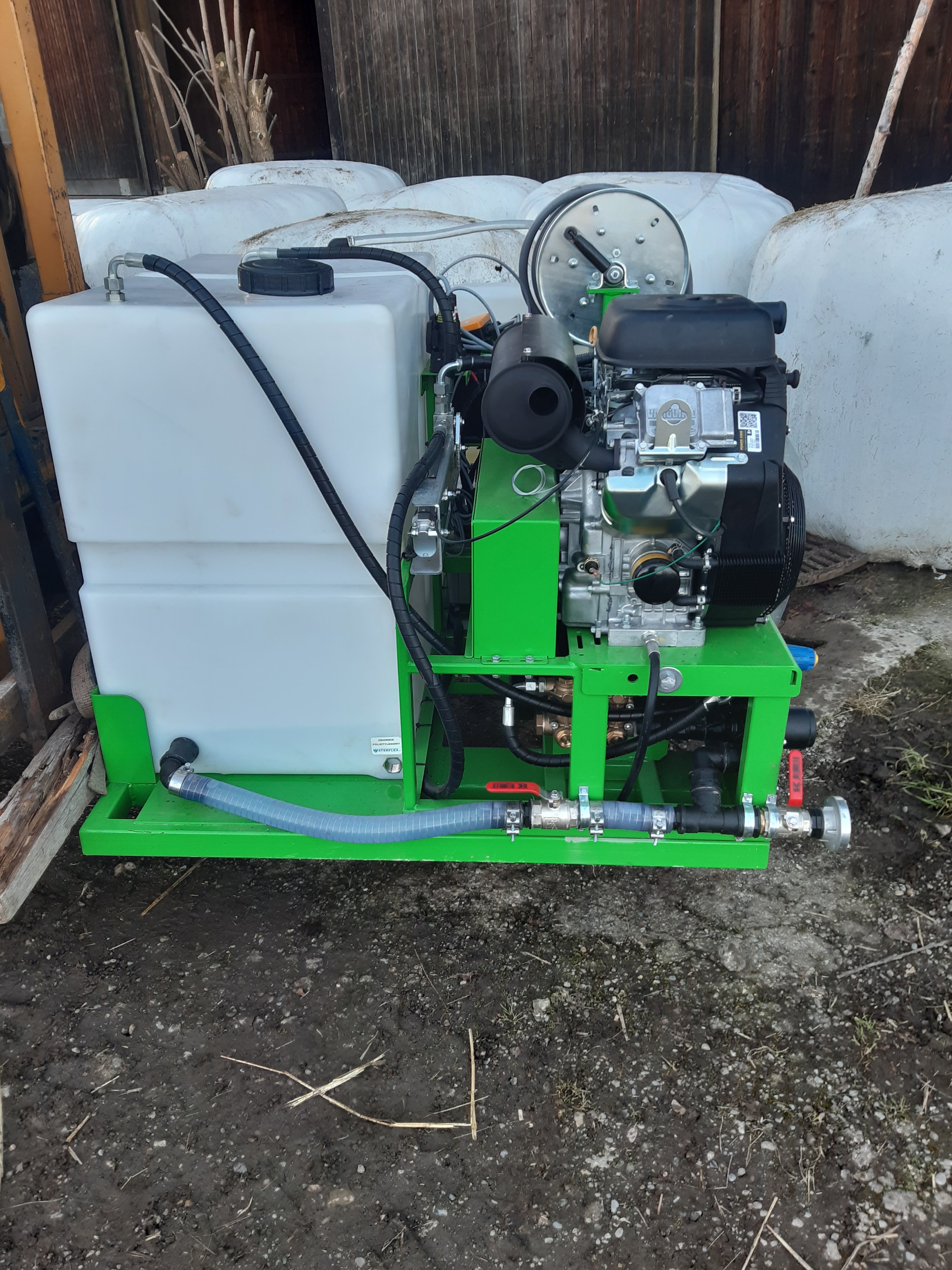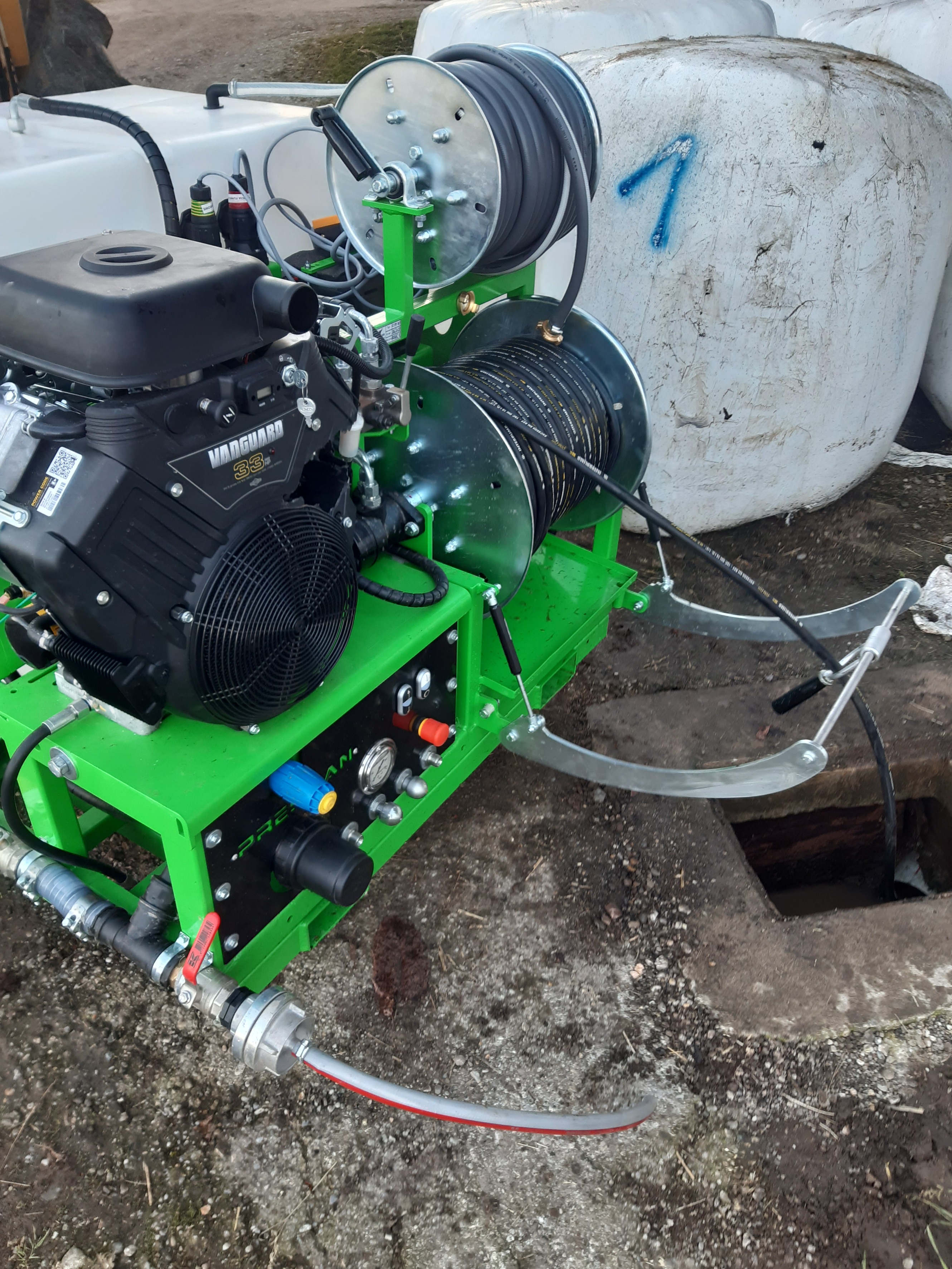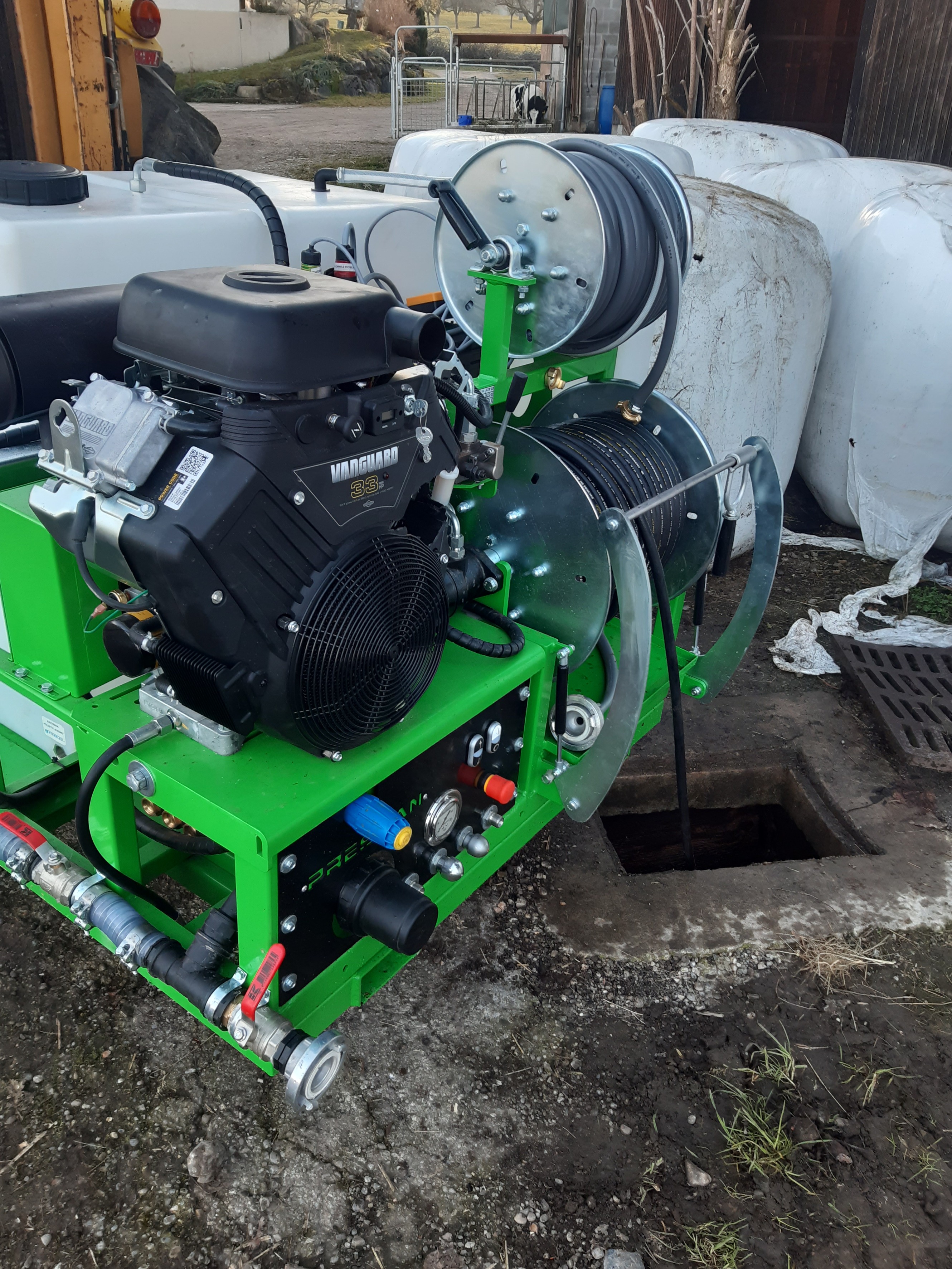 Durch unsere praktische Erfahrung in der  Drainagengeinigung haben wir festgestellt, dass es kein optimales Drainagenreinigungsgerät gibt. Gerade in der Schweiz sind doch die Anforderungen aufgrund der unterschiedlichen Böden und des verwendeten Drainagenmaterials, sehr verschieden. Mit der falschen Spültechnik können Drainagen zerstört oder nicht erfolgreich gereinigt werden. So haben wir beschlossen ein eigenes Spülgerät, optimiert für die Drainagenreinigung, zu konstruieren. Dabei sind wichtige Punkte wie, praktische Handhabung, Effizienz, Wartungsfreundlichkeit, Flexibilität, Reinigungsleistung und Preis-Leistungsverhältnis bei der Konstruktion umgesetzt worden. Um all diese Punkte erfüllen zu können, müssen Pumpenleistung, Schlauchdurchmesser, Schlauchlänge, Schlauchhaspel sowie Düsenmaterial bezüglich Einsatzzweck genau aufeinander abgestimmt sein.